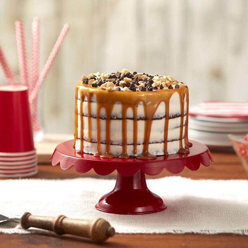 A five-layer brownie cake. That's what taking your game day snacking to the next level looks like. Decadent layers of rich brownie surrounded by fresh-whipped buttercream frosting filled with mini chocolate morsels and peanuts with sweet caramel sauce drippy down the sizes. Make all 5 decadent brownie layers using the Easy Layers Pan Set.