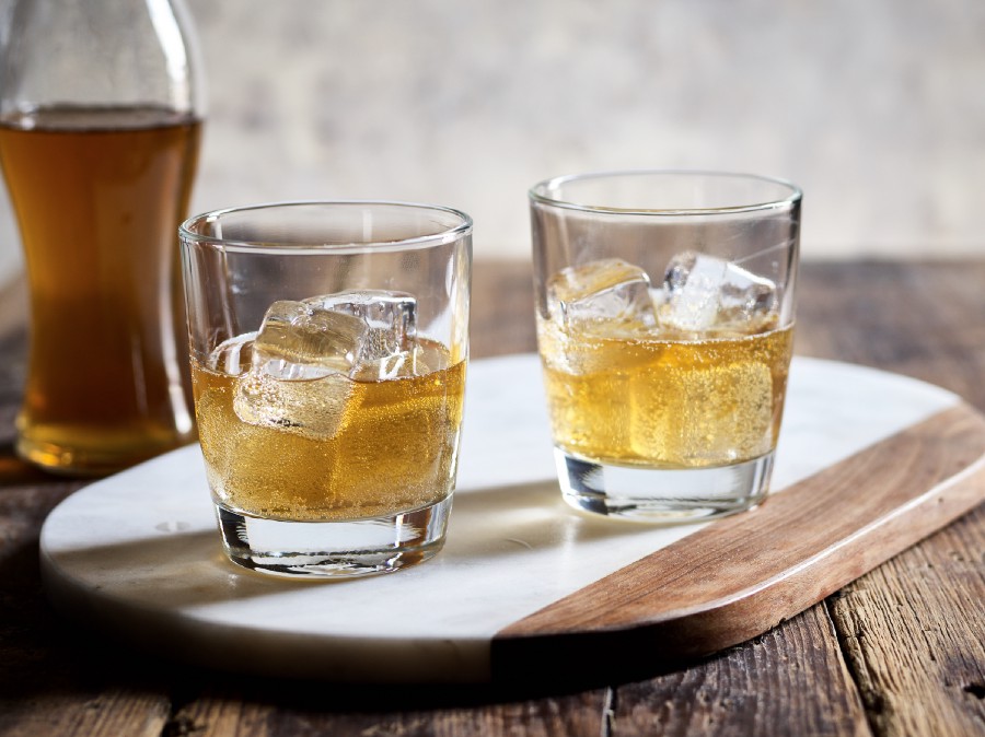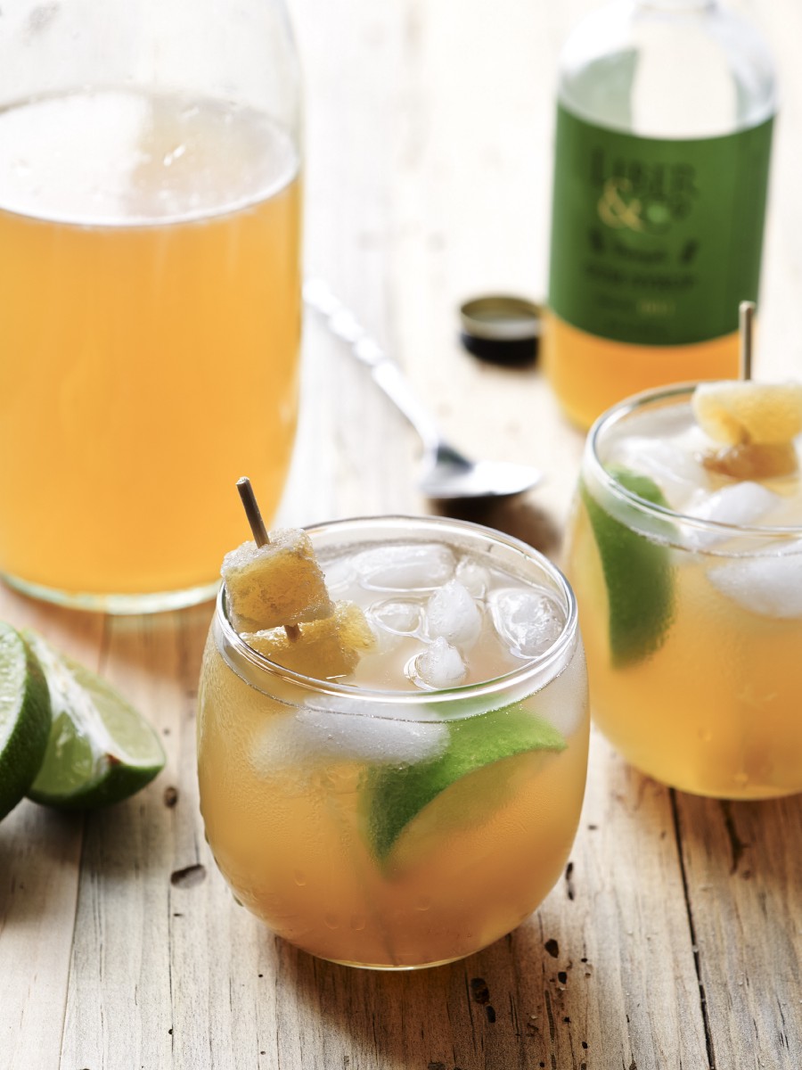 2. Divide among glasses filled with ice, garnish with lime and candied ginger